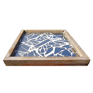 Materiaal: hout met ingelegd mozaïek van gebroken spiegelstukjes, afgewerkt met een gladde glaslaag.