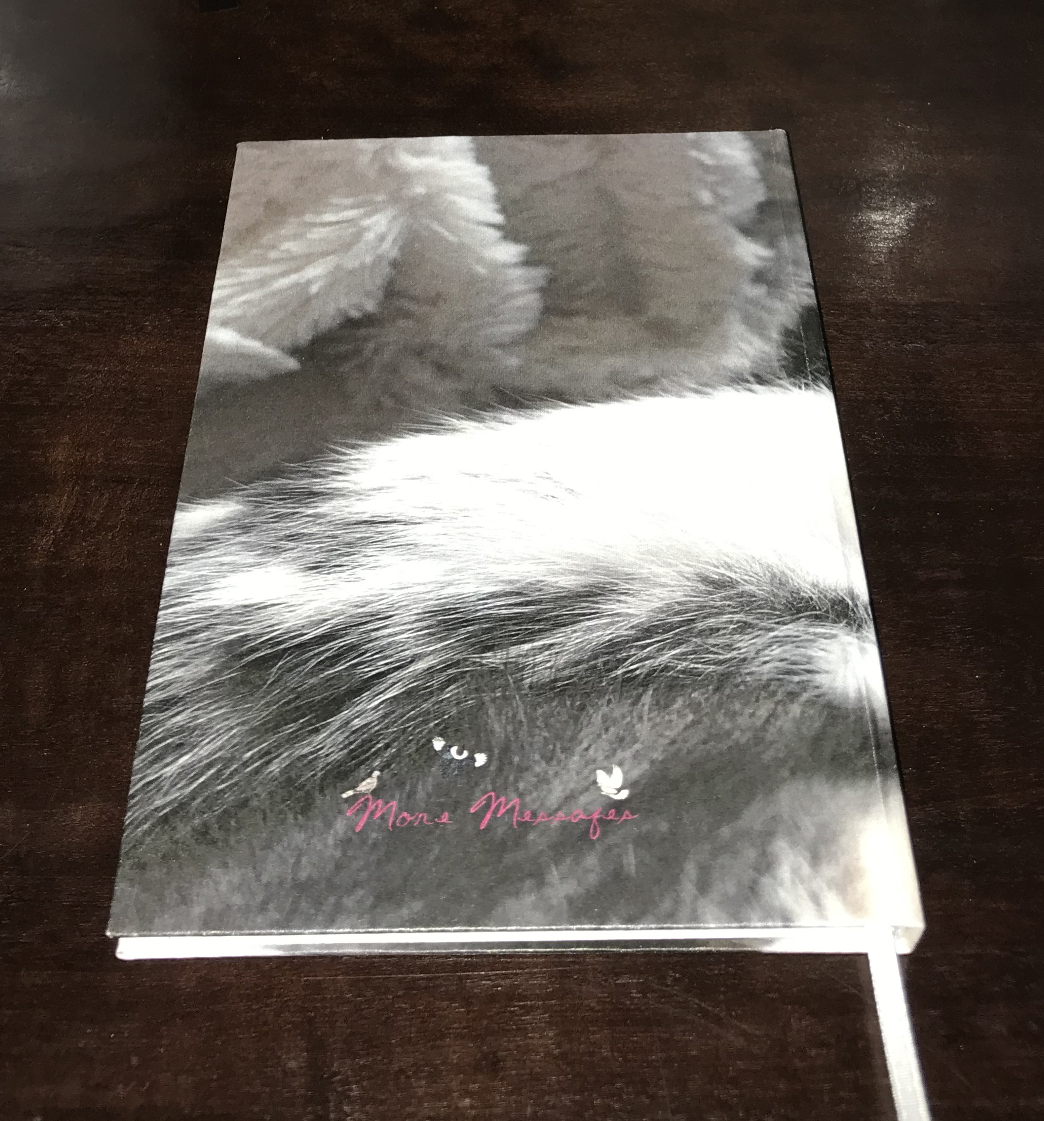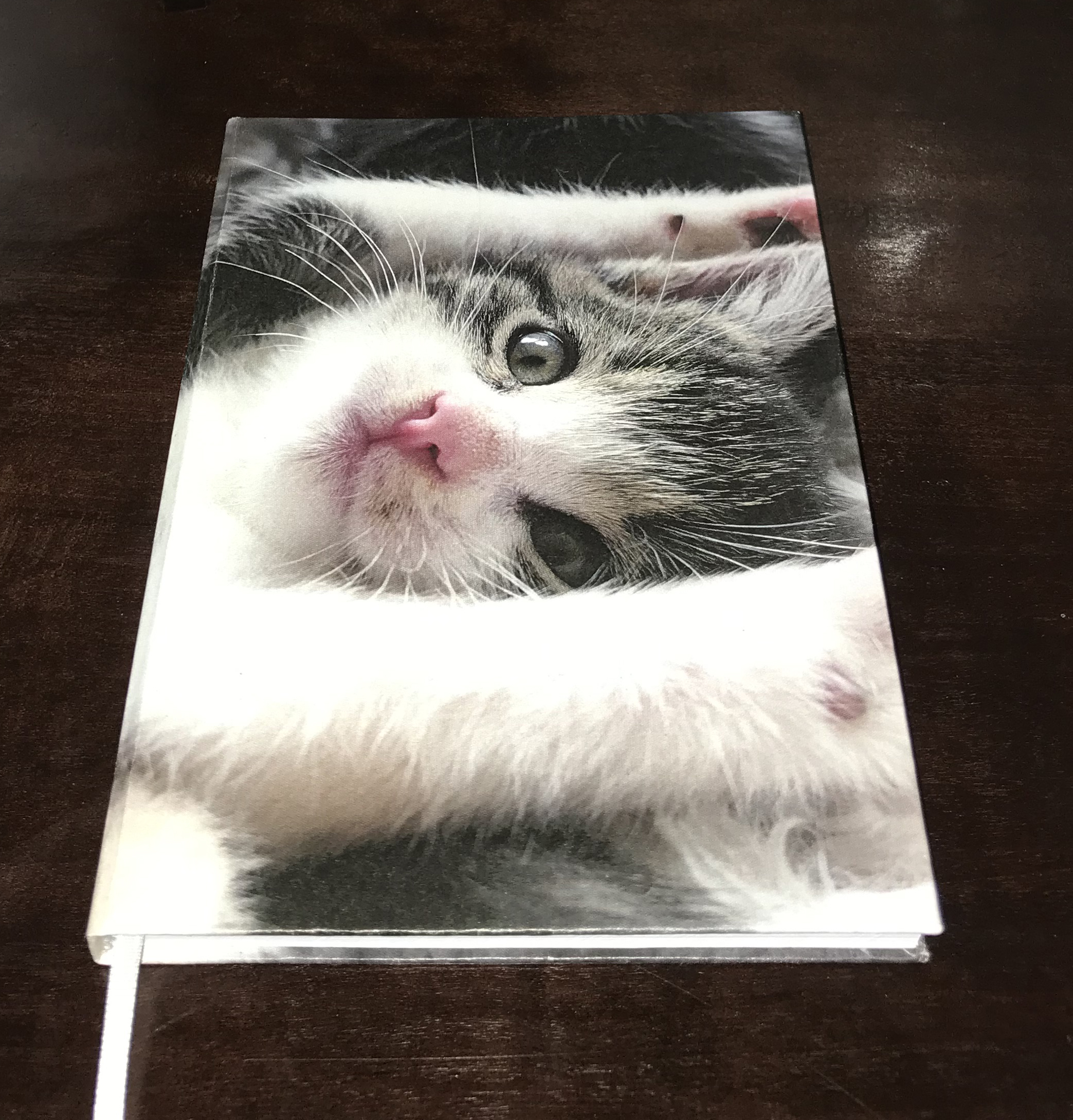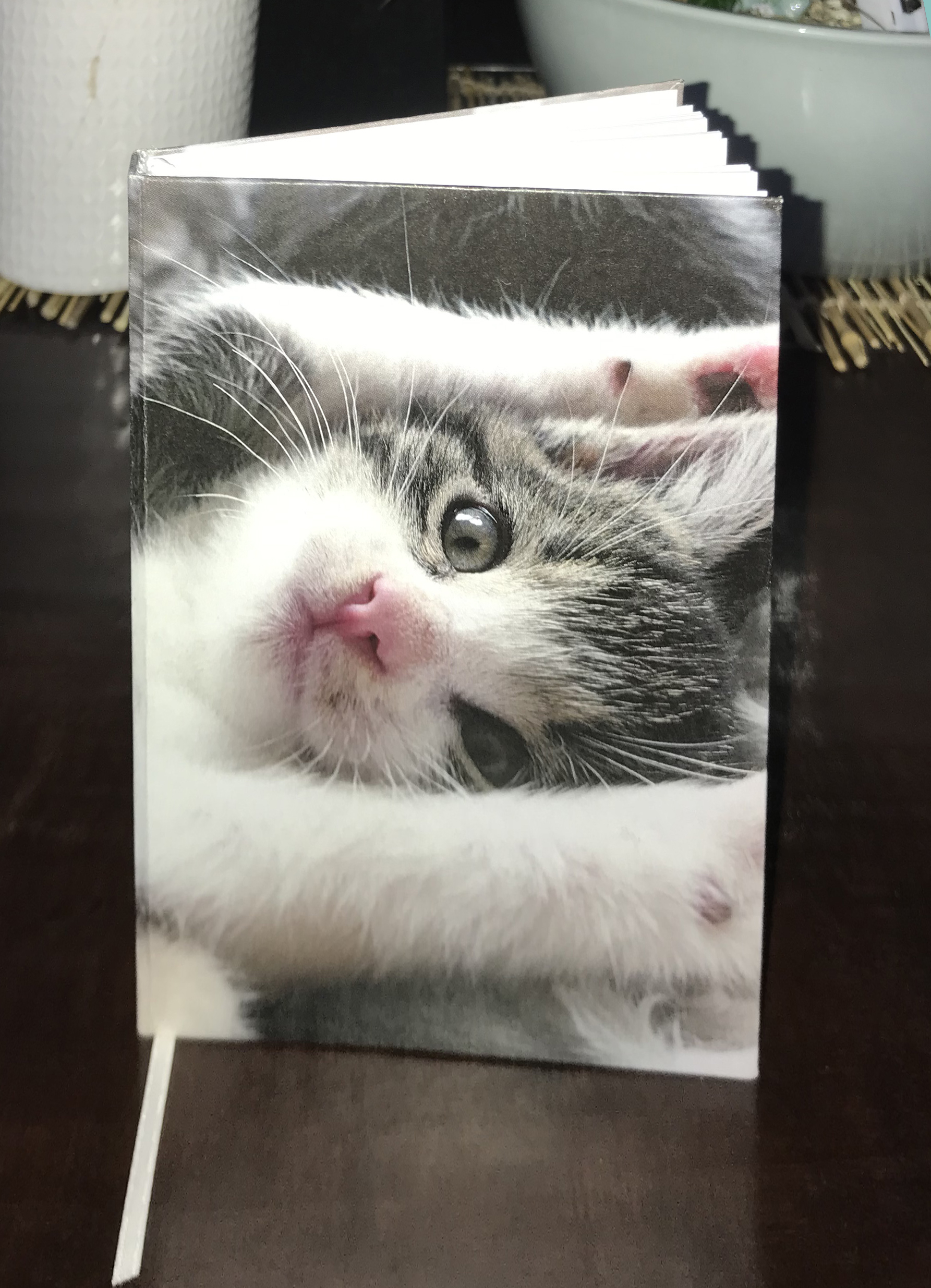 Handgebonden en gelijmd notitieboekje met een kitten op de cover. De binnenzijde is gelinieerd. Compleet afgewerkt met boeklintje.