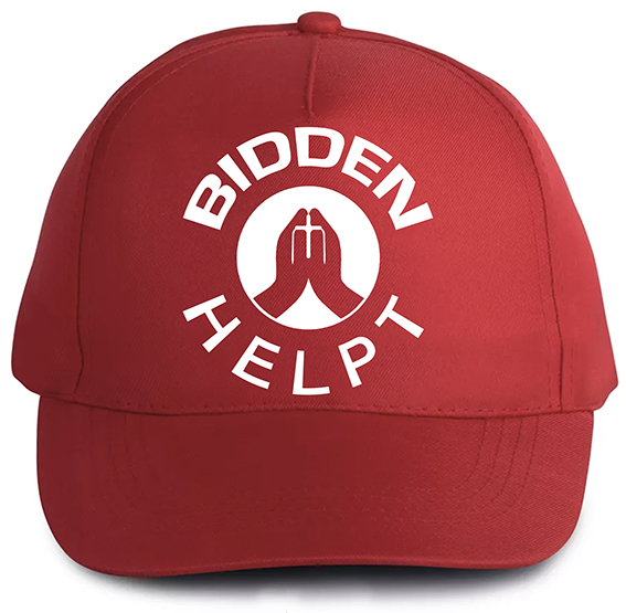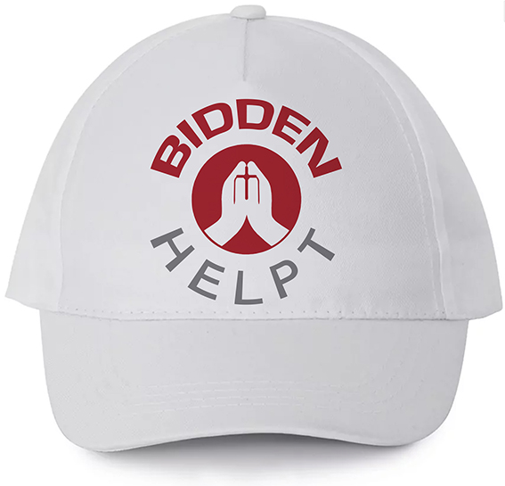 Deze pet met opdruk ‘Bidden Helpt’, is voorzien van klittenband.